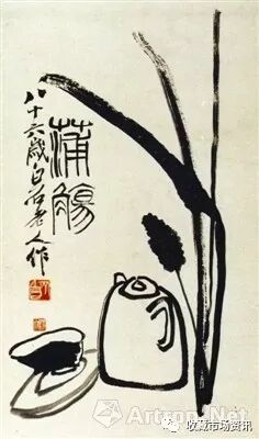 齐白石作于1946年的《蒲觞》 1922年,六十岁的齐白石在陈师曾的引荐下,在日本东京的“中日联合会画展”上一举成名,两尺的山水就卖到250元银币。齐白石称,这在国内是想也不敢想的。这次日本展览后,到北京来买齐白石画的外国人不计其数,国内投机商人和附庸风雅的人也纷纷求购他的画,一时间可谓“洛阳纸贵”。齐白石作为湖南湘潭一个弄“小器作”的雕花手艺人,竟先在北京画坛,继而又在中国乃至世界画坛成就了大名,这是谁也不曾想到的。齐白石感慨道:“平生羞杀传名姓,海国都知老画家。”。 至少有三位来到中国的洋画家极崇拜齐白石的画,一个是日本人须磨弥吉郎,一个是法国人克罗多,另一个是捷克斯洛伐克人沃捷赫·齐蒂尔。1927年,作为日本外交官的须磨弥吉郎向德国和美国的公使郑重推荐齐白石的画,并称齐白石是“中国的塞尚”。也在这一年,与齐白石同在北京国立艺专教书的法籍教师克罗多则称赞齐白石是“最可钦佩的画家”,称他的作品“与近世艺术潮流殊为吻合”,是典型的“中国艺术界之创造者”。捷克斯洛伐克画家兼收藏家沃捷赫·齐蒂尔视齐白石为“中国绘画史上里程碑似的天才艺术家”,受到他的影响,捷克斯洛伐克至今仍旧是除中国以外收藏齐白石作品最多的国家。 1917年,陈师曾在北京琉璃厂南纸铺看到齐白石大气磅礴的篆刻后被其折服,遂与齐白石成了莫逆之交,这才有了他拿吴昌硕画作给齐白石研究并鼓励变法的故事。变法后的齐白石画作大俗大雅、大拙大巧、自家面貌逐步形成,也符合了“新文化运动下”中国画发展的现代诉求。20世纪是“唯新是求”的革命世纪,这股民主思潮要求艺术必须要融入民间和民众,齐白石无疑符合了这一要求,所以齐白石受到北平艺专“革新派”林风眠和徐悲鸿等校长的推崇,将其聘为“教授”若干年。 齐白石的线形是有生命的。他在金石书法上下了很大功夫,用中国笔墨工具保证了他对线条的最大表现力,这些都是在刻画物象背后完成的工作,因为他知道这是支撑他画面的“钢筋骨架”,他必须把线形和空间解决好。尽管没有出国去了解西方现代艺术是什么,印章也同样给他帮了大忙,“计白当黑”的线性分割和流动气韵及大开大合的简洁章法营造了全新感受。他还有意识地关注画面的边角营造,弱化三维深度的空间,加强平面张力的视觉冲击力和一种不循规蹈矩的“纵横气”。中国汉字本身的形象性与抽象性在其印章中体现出的强烈现代意识,足以震惊到许多现代艺术家,所以东西方洋人喜欢也是正常的。当然,他还利用他曾做过雕花木匠的一些能力到印章里:一刀刀地刻,从不磨蹭,稚拙而又大气地完成印面。他说:“世间事贵痛快,何况风雅事?”这就是古法精神——“画画如作字法笔笔分明”,刻印更应如此。他刻印时随着字的笔势,顺刻下去,并不需要先在石上描好字形,才去下刀。 齐白石取法广泛,曾下苦工吸收近代诸家之长最终熔铸成了自己的风格,他说:“青藤八大远凡胎,老缶衰年别有才。我欲九原为走狗,三家门下转轮来。”他有两个办法学习传统,一个是“背”,即把看过的名家画作,用自己的方式背下来,再用自己的风格画出来,把别人的东西消化为自己的表达。第二个是“改”,见到好的造型,他会按照自己的情感把它改成自己的风格样式。 这次山东美术馆展出的画作大多是齐白石在上世纪40年代和50年代的作品,风格高度成熟,艺术境界炉火纯青,笔墨线条老辣纷披、书法遒劲自然,色彩古雅艳丽。如作于1946年的《蒲觞》一画,纯用墨笔勾勒而成,几只蒲草用开张苍劲的浓墨粗笔率意写出,而下方酒壶酒杯用同样古拙的圆笔从容勾写,造型含蓄浑厚、稚趣盎然。 齐白石坚持用“天真善良”的眼光看世界,表达中国人对美好生活的向往以及对别人“如意”的祝福,但有时也会像孩子一样爱憎分明,即使表现愤怒,他的落款也是“人骂我我亦骂人”这样可爱的话。齐白石还画过苍蝇、蚊子、老鼠,这些在别人看来是讨厌的东西,而齐白石却以一种儿童的心理来描绘它们,发现它们的美,甚至引起我们的一些反思。 今天,我们依然喜欢他的绘画,这不仅是因为他的画通俗易懂,其生活态度感动人,还因为他带着一双发现美的眼睛,鼓励我们不断地从平凡生活中寻找一种朴素而又伟大的东西——真诚,这依然是当代人所缺失 的。他反对矫揉造作的艺术,他认为美必须是“真诚”、“自然”的,他把自己细微的生活体验和感悟都转化到艺术创作中,也不画他不了解或没见过的东西。他说:“胸中山水奇天下,删去临摹手一双”“形似未真,何能传神?”艺术须以生活为基础,不重生活写真,观察入微,仅靠模仿,如何感动自己、感动别人?从他身上,我们懂得了一个道理:画家先要完成表现生活化的“能品”,才能到达艺术的“妙品”“神品”乃至“逸品”。 山东画坛近代以来的传统来源,在解放前曾受到“海派”的影响,解放后又受到“京津画派”及浙江画风的影响,所以是一种综合外来的风格形态。齐白石作为连接海派和京津风格的核心人物对山东中国画的影响非常大,未来这种影响还将继续下去。我们关注山东美术馆展出的“大师窖藏”齐白石作品,就是要近距离地感受齐白石的时代语言风貌和笔墨特征,领略大师的魅力和风采,研究创新规律,启发大家独立发现自己身边美好的事物,深