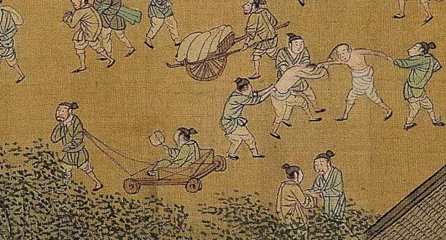 仇英版《清明上河图》的结构大体按北宋张择端《清明上河图》的景物顺序布局,但描绘的是明朝中期苏州繁荣的景象。与呈现汴梁风土人情的张择端《清明上河图》相比,仇英版《清明上河图卷》中房屋建筑更为规整宏大。接下来就盘点一下仇英版《清明上河图》的萌点和槽点。 裸奔 男人打架也扯头发!还光膀子,看来这一行为与男女无关,与头发长短有关。 “爹,出去看热闹嘛,外边有人扯头发。” 来,摔个跤,我赌白裤子赢。 “我就是扛木头累了,拗个造型而已。” 市场 客官,来个元青花怎么样?就一两银子! “小明,那个唐三彩貌似是假的。” 车 这独轮坐的,何止一个爽字。 嗯,你们先扯头发,我就是坐着四轮车路过而已。 熊孩子们 就是袖子长了点 放牛郎 娱乐 难道这就是号称起源于中国,但现在踢得不咋地的。。。蹴鞠。。。? 放羊、放风筝 那时学士府门口就有摆摊的 这秋千,其实挺高的。 西域艺人 露天戏台,那个远处树杈上的朋友,你注意安全! 那个踩凳子看戏的娃娃,其实你们也可以上树。 其它 化个缘 摆好姿势,等妹撩 我就是想静静 画个像 踩水车的兄台,你是刚摔完跤的那位吗? 张择端的《清明上河图》描绘的是北宋时期京城汴梁的景色,而仇英的《清明上河图》描绘的是明朝苏州城的优美风景,以及江南民众的生活,整幅画卷共有两千多人,男女老少,市民、商人、农夫、艺人各种身份,每个人物的动作、服饰都不雷同。此外,仇英在临摹原本的基础上进行了二次创作,增加了某些场景,同时也对某些细小的场景作出相应的变动,突出了亮点,做出了特色。 那志良先生对仇英夸奖道:“仇英身处明代,是土生土长的江南人,在对《清明上河图》进行临摹时能巧妙地除去宋朝的一些旧体制,将符合时代特色的社会景象添加其中,内容衔接得当,颇具特色。” 看完静态,现在请欣赏动起来的《清明上河图》! (图文/少白公子) 画家简介: