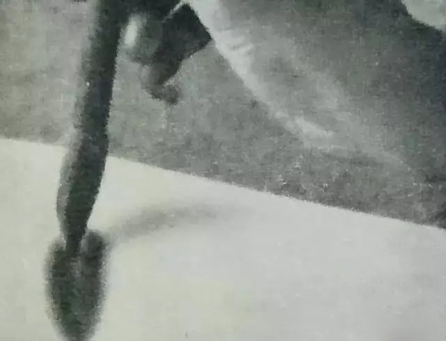 3、清水点到笔根以后,再用左手将笔尖轻轻捏扁,利用捏扁的笔尖,以笔锋横画一下,画出虾抢。