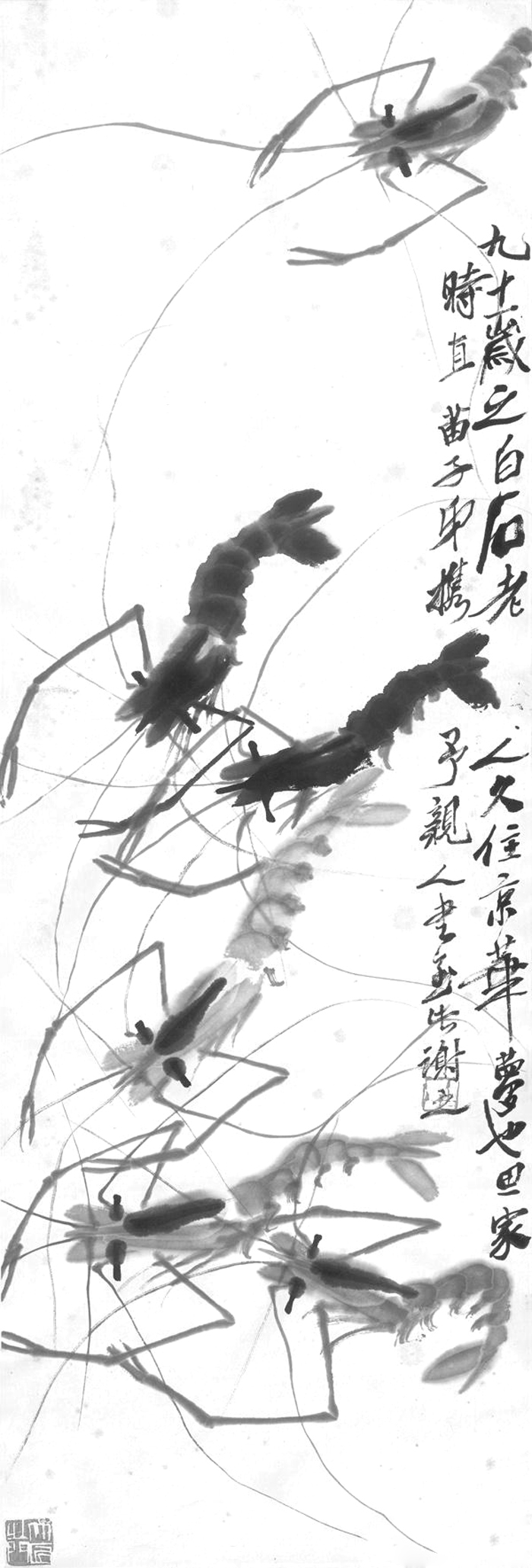 有不少权威机构的齐白石的专家都说齐白石的水墨画确实画的好,因为齐白石大多画的是花草虫鱼,属小品把玩,齐白石画了一辈子的虾,那么喜欢齐白石画的虾你应该知道些什么?首先您应该知道齐白石他一辈子都在研究怎么把虾画好,画出神!画像就很不容易,画出神就更要极高的艺术修养!九十岁画虾,已经把虾的胡须给给省去了!齐白石画虾,尤其是浓淡墨的处理可谓妙不可言。虾头、虾身皆用浓淡表现,虾群更以浓淡参差而布,特别是上半部的十几唉虾,多而不乱,构图极为巧妙,层次分明,姿态各异,而能统一协调。