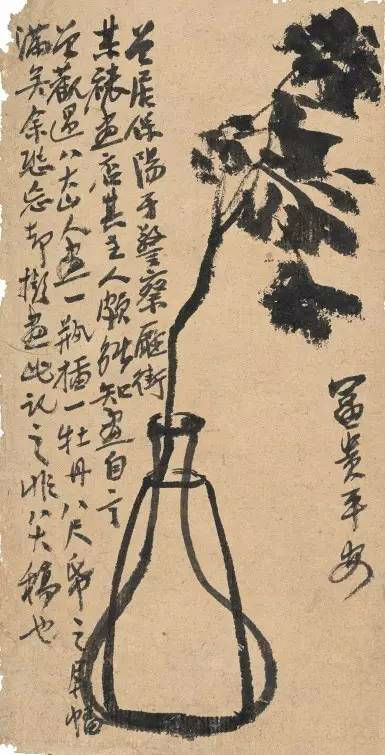 富贵平安托片纸本墨笔21cm×11cm无年款北京画院藏 题款:富贵平安。曾居保阳于警察厅街某裱画店,其主人颇能知画,自言曾观过八大山人画,一瓶一插牡丹,八尺纸之屏幅满矣。余恐忘却,拟画此记之,非八大稿也。