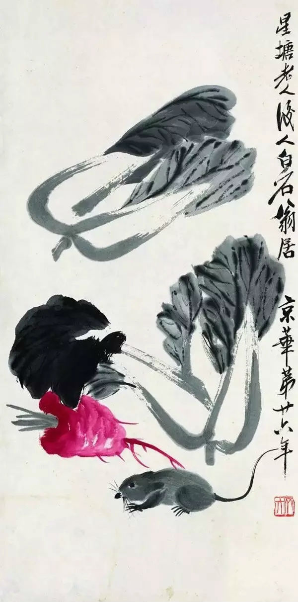齐白石爱大白菜是出了名的,一天他在画室里听到外面有呦喝卖大白菜的,便想画一张白菜去换白菜,谁知被卖菜汉子一顿咆哮: “我不看你一大把岁数,窝心脚窝死你。倒想得美,拿一张画的假白菜换我一车白菜!” 齐老只得着灰溜溜的走了,也不生气只自嘲一句,“嗨!真是有辱斯文!”